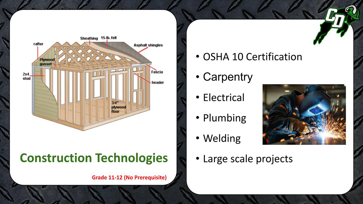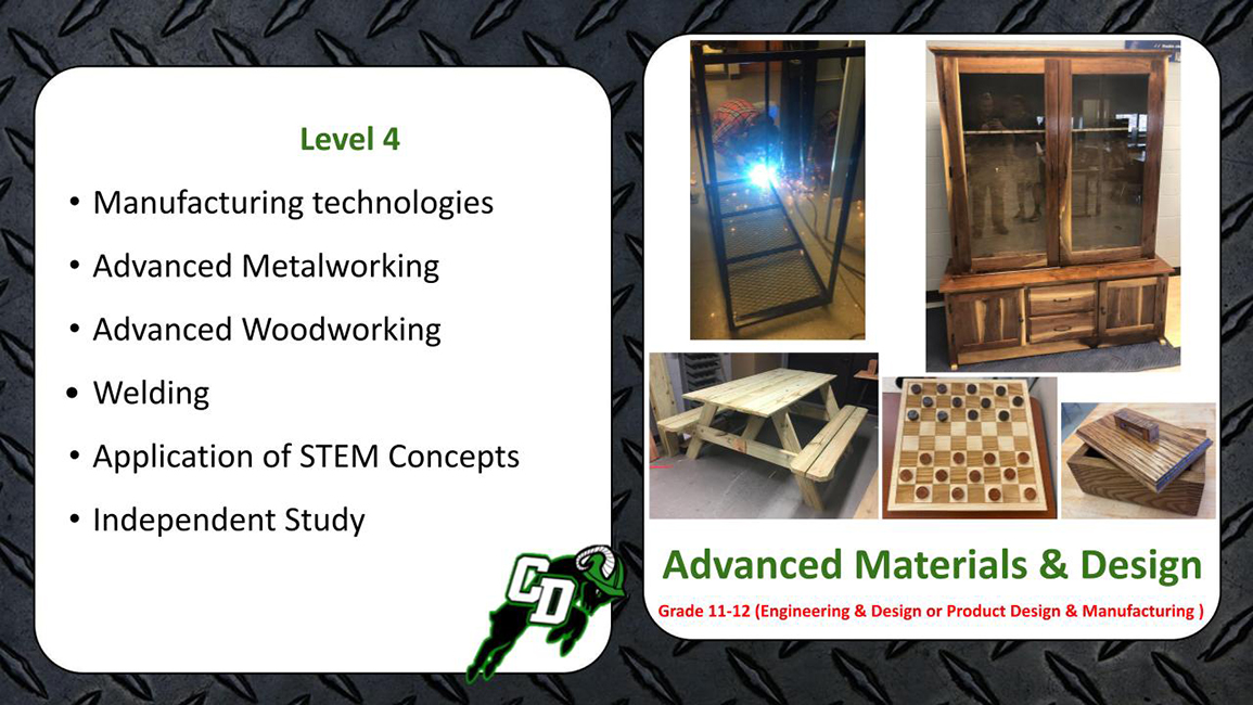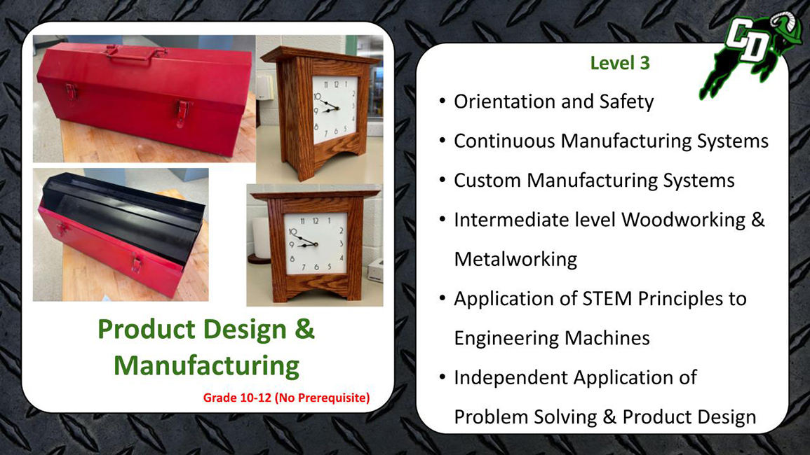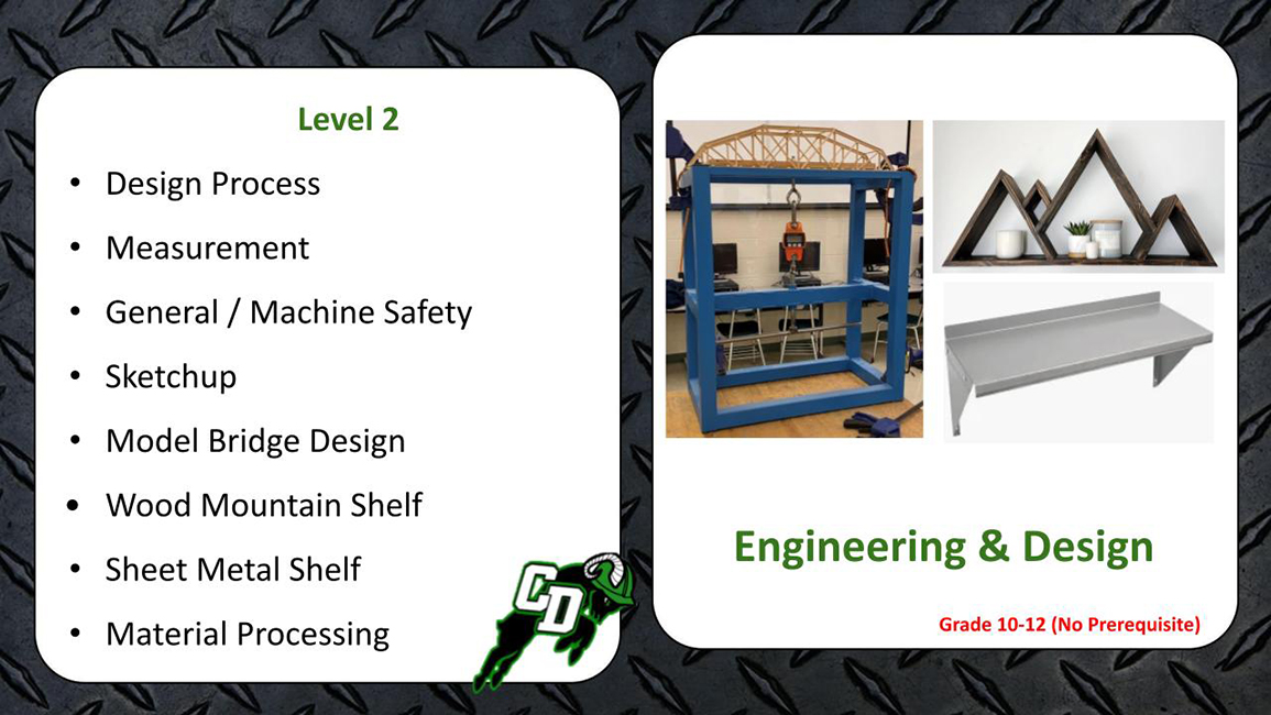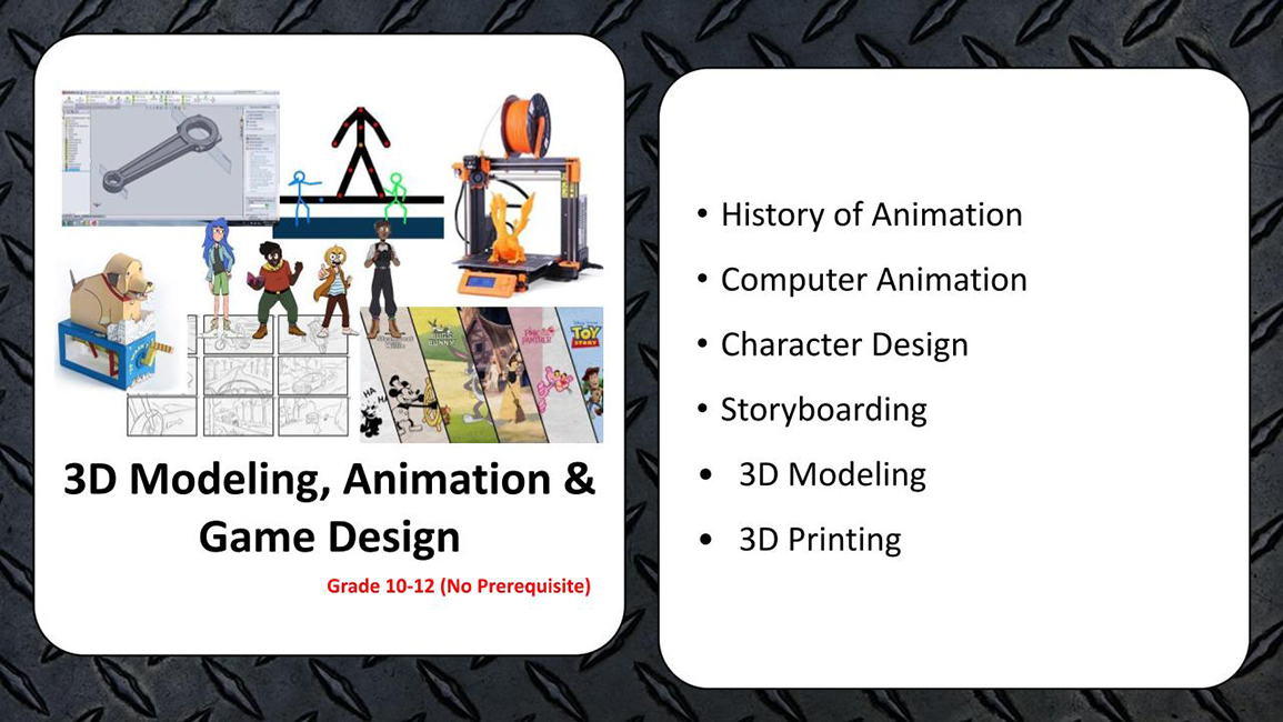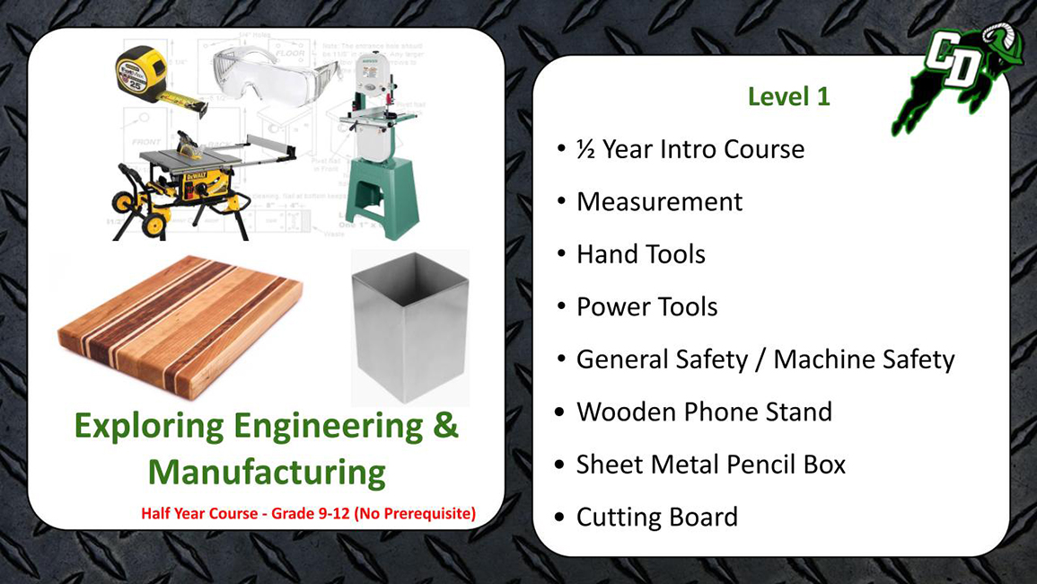 This course is designed to introduce ninth grade students to the Central Dauphin School District’s Technology Education program. Students are given a glimpse into the variety of courses offered at the high school in the areas of engineering, technical and digital design, animation, architecture, robotics, and manufacturing. Technological evolution, digital design, material fabrication, and engineering problem solving concepts will be covered. This course will help students decide which future classes will help them reach their career and personal goals.