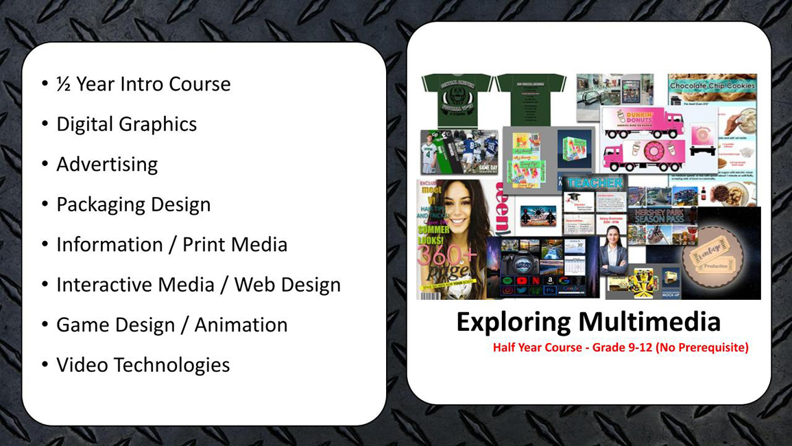 This course is designed to introduce students to the Central Dauphin School District’s multimedia program. Students are given a glimpse into the variety of courses offered at the high school in the areas of digital graphics, promotional graphics, games design and animation, and TV studio. Graphic design, advertising, video, and animation will be covered. This half-year course will help students decide which future classes will help them reach their career and personal goals.