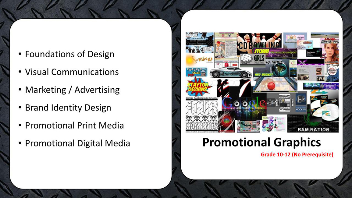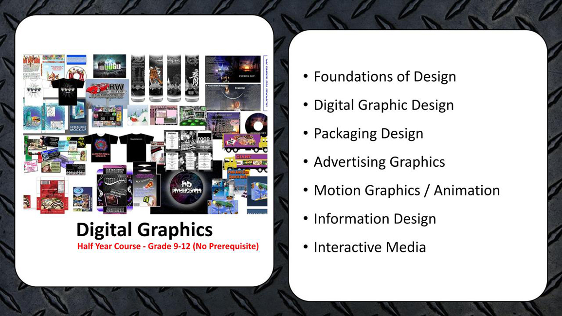 The average American is exposed to 300 - 700 advertisements per day. Promotional graphics are everywhere, and our world needs creative individuals to design, develop, create, and evaluate these advertisements. In this course, students will learn about advertising, graphics, print and digital media, animation, brand identity design, and applying Adobe software. This project-based course will challenge students with creative thinking and real-world problem-solving activities. This course is available to Sophomores, Juniors, and Seniors only.