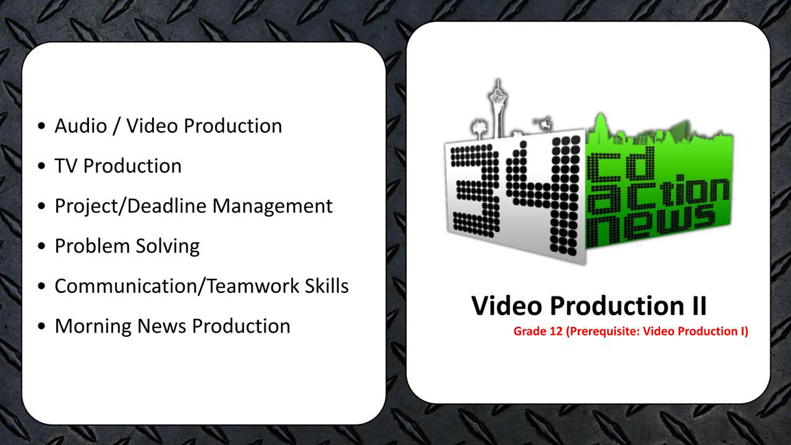 Students enrolled in TV Studio 2 will be challenged with various communication and problem-solving activities, independent studies and special projects for the school and community. Students will communicate daily news by creating audio and video productions, special features, graphics, and web content. Students will work throughout the year, continuously solving one digital media problem after another. TV Studio crew members must be able to attend various after school events. This course is available to Seniors only.