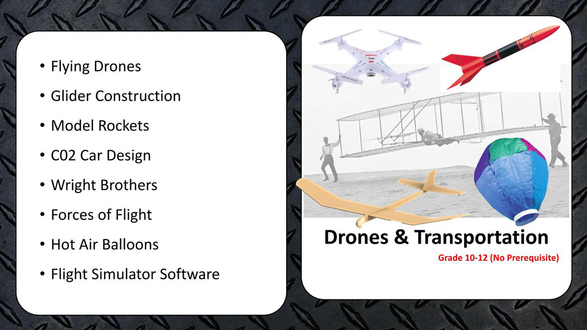 Drones represent cutting edge technology that has become a major factor in a large variety of global industries. This class teaches students the skills and knowledge to maintain, operate and successfully utilize the power of drone technology and the theory of flight. Participation in this course will also prepare students to take the FAA Par 107 UAS Certification, Remote Airman’s Certificate that is required for commercial use (certification is optional and not provided with the course). This course is available to Sophomores, Juniors, and Seniors only.